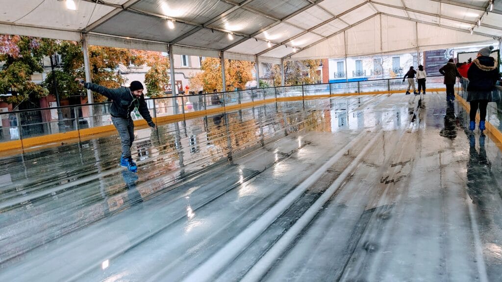 Five different venues in the city offer ice skating: Matadero, Cibeles, Plaza de España, Colon and Plaza Juan Goytisolo. The last three have the advantage of being right by Christmas markets but all are really pretty venues. Prices start from around 7.50 euros. Needless to say, this is a really popular family activity so book in advance to avoid disappointment. Having said that, the one in Plaza Juan Goytisolo (pictured below) tends to be less busy than other rinks. More advanced ice skaters should note that these rinks tend to be crowded. If you´re a whizz on the ice, better to head to the huge 4760 m² rink at Riyadh Air Metropolitano stadium where there will be more space to show off!