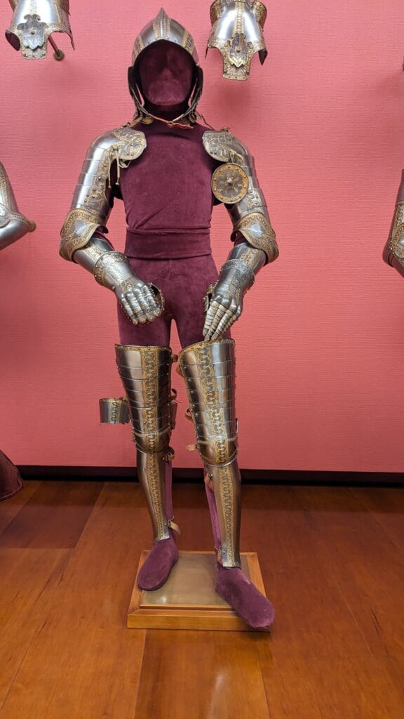 One of the pleasures of this collection is that alongside the armour you’ll find reproductions of portraits showing these kings wearing the actual pieces on display beside them. Standing in front of Philip II’s armour with his portrait next to it is a surprisingly moving experience — cloth invitably decays, but metal endures, giving you a real sense of proximity to these figures.